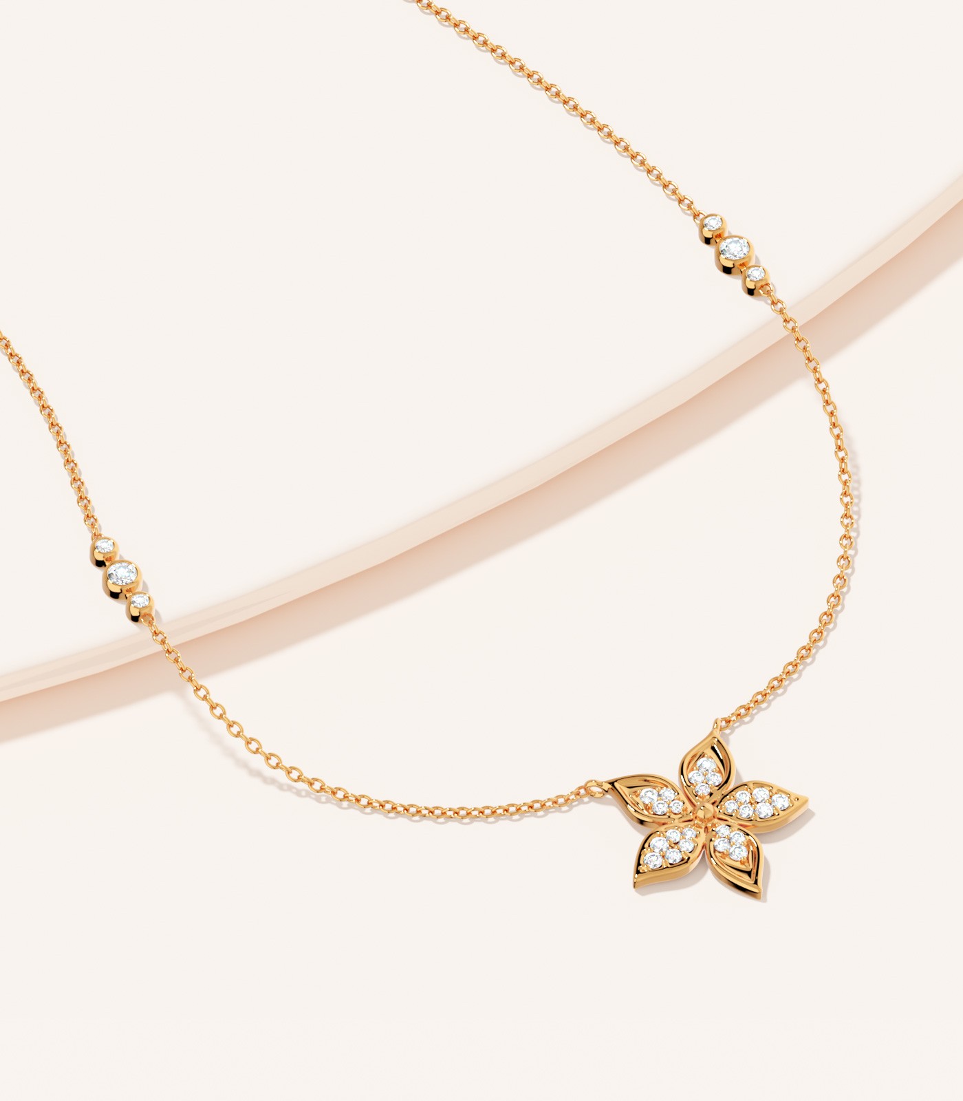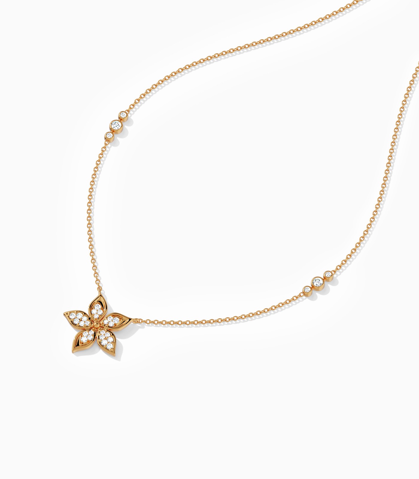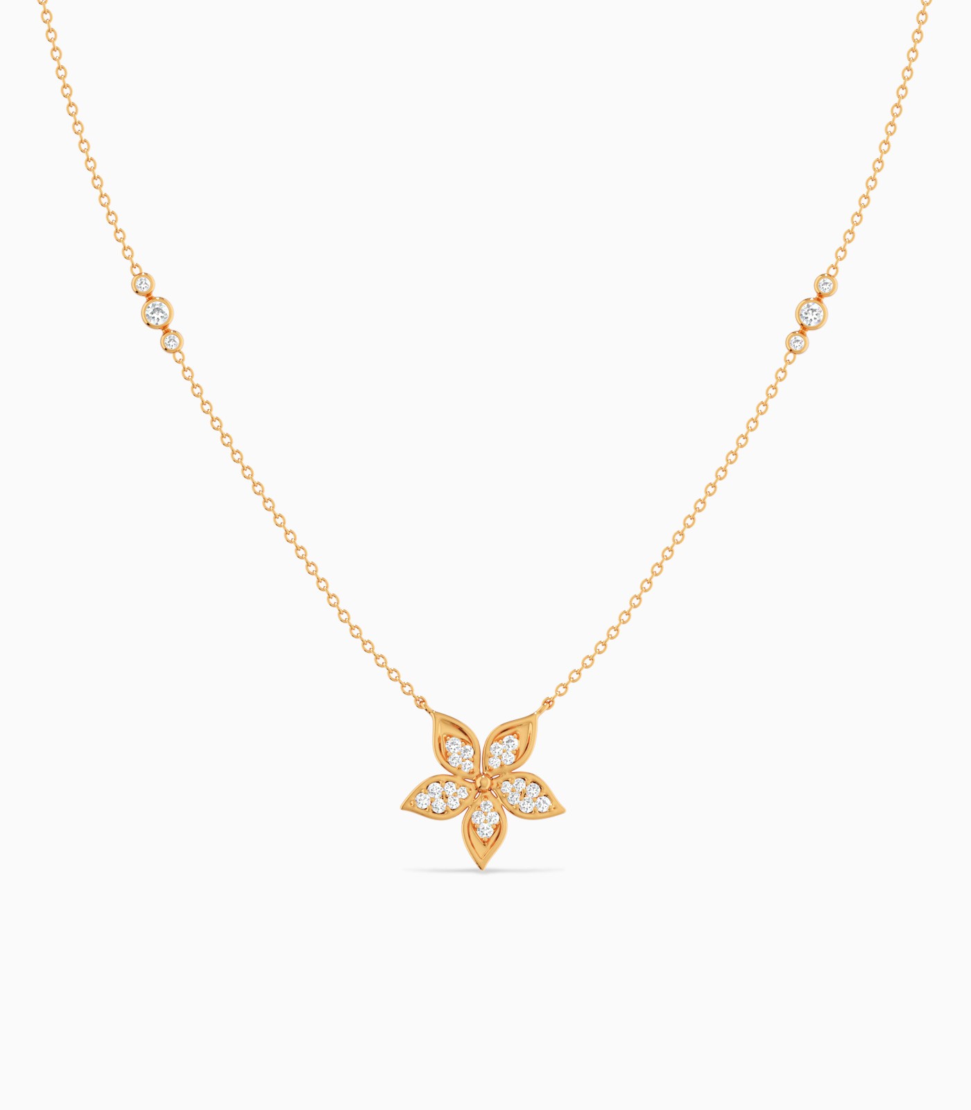Elegant and delicate, this 18k gold necklace features a floral motif with diamond-encrusted petals, gracefully suspended on a fine chain which is in turn, embellished with three tiny diamonds on either side. It’s a timeless piece for everyday wear or special occasions.