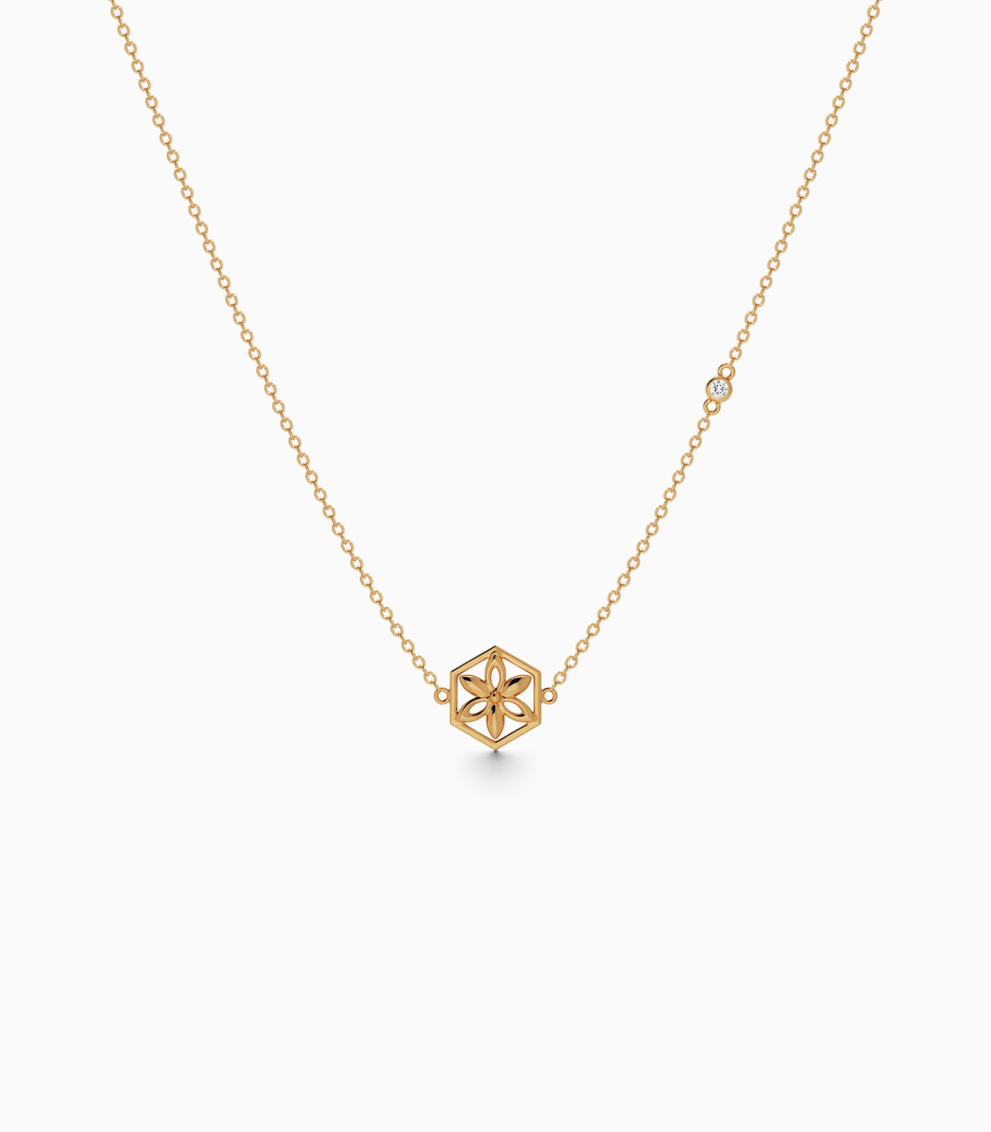This 18k gold pendant has a hexagon frame encasing a delicate six-petal flower with solid and hollow petals. A single diamond on the chain adds a touch of brilliance. Perfect for daily or office use, it’s for those who love a minimalist design with the glitter of gold.