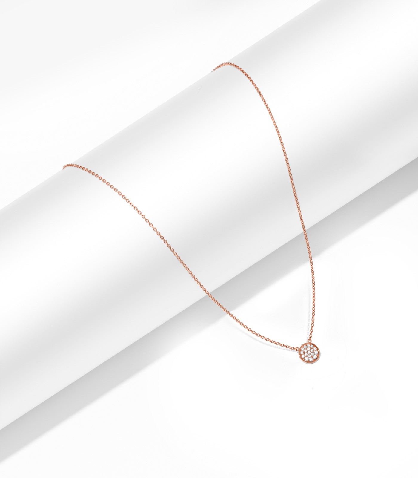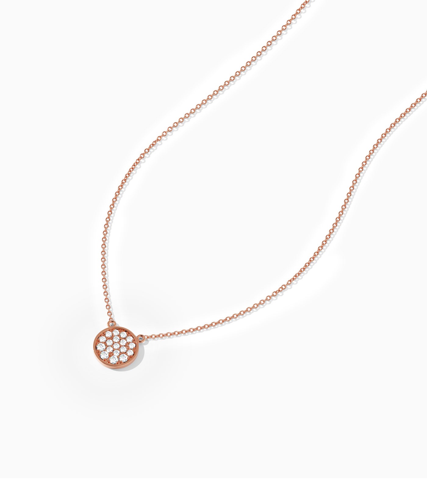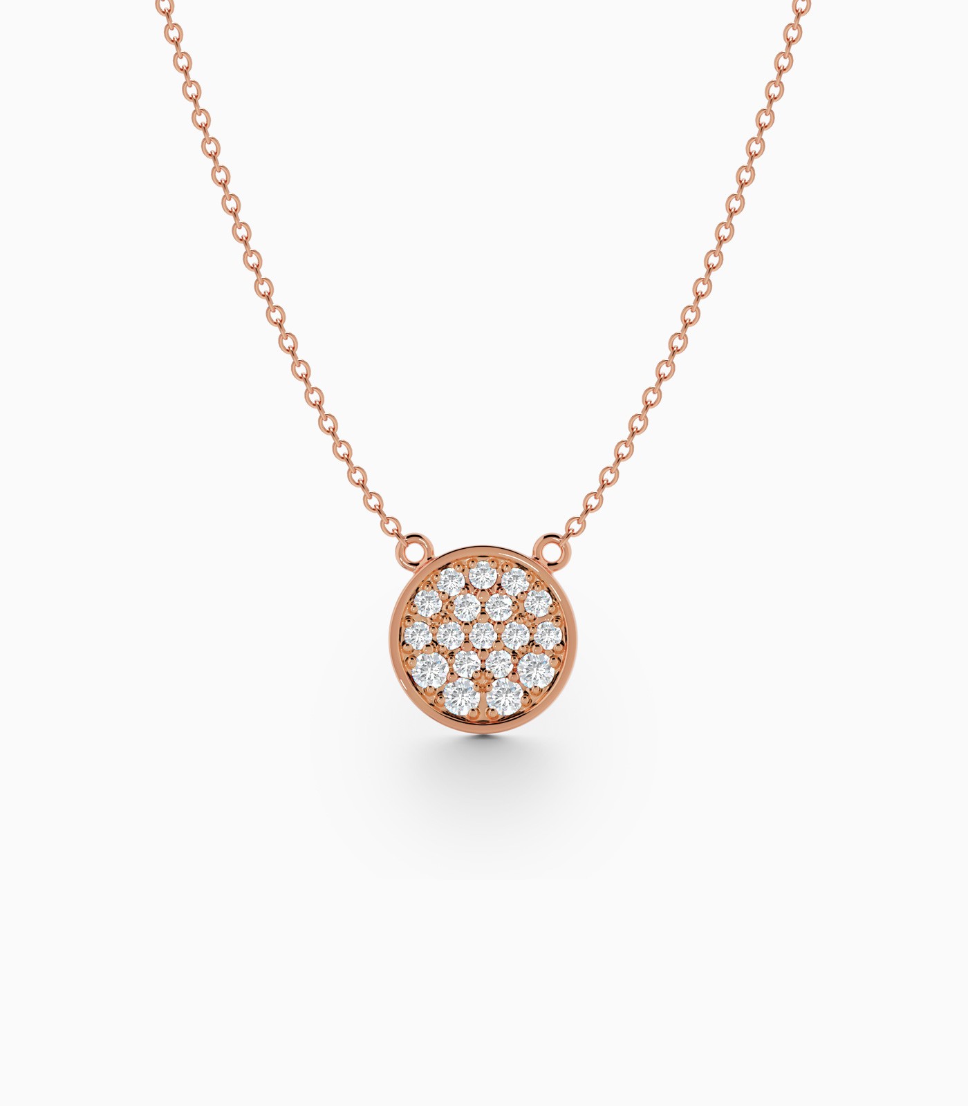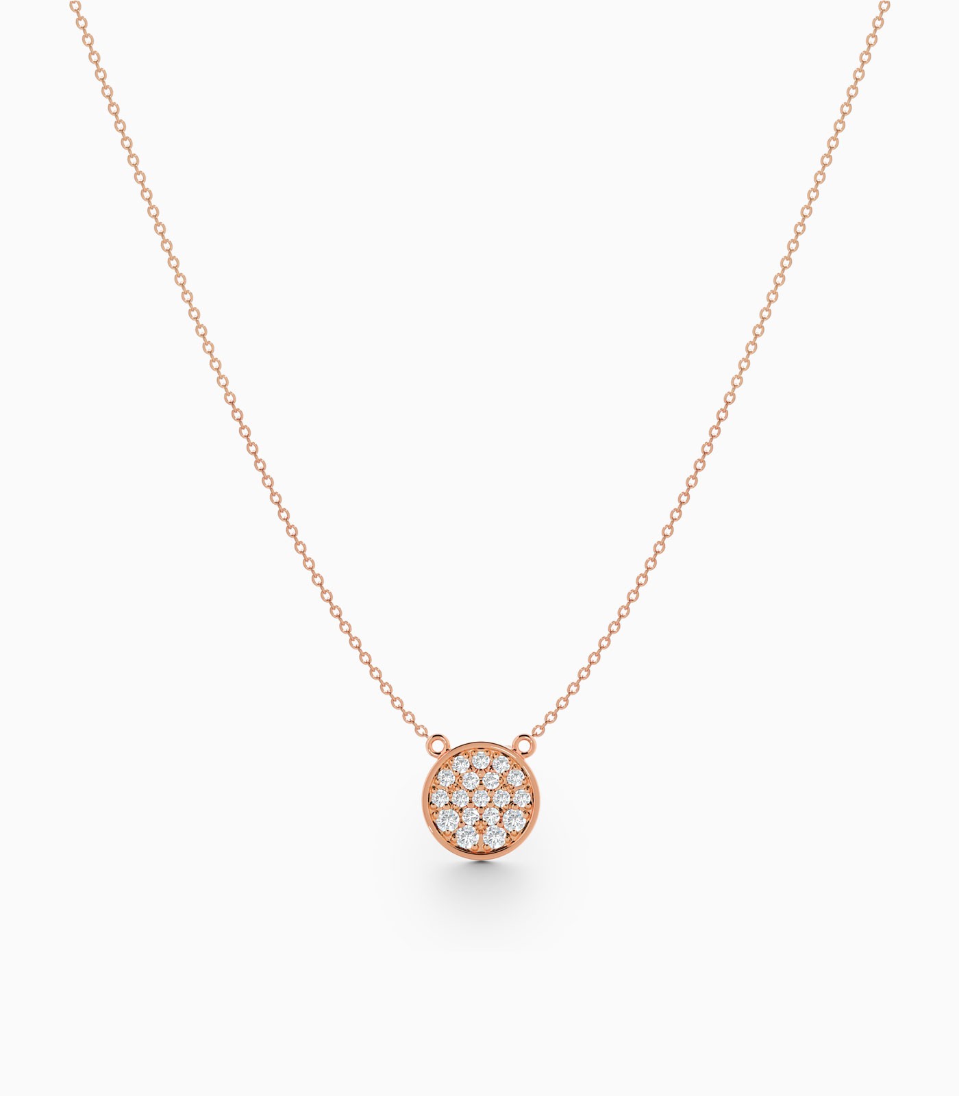 Classic elegance meets simplicity in our 18k gold disc diamond pendant. The gold disc, densely inset with a pavé of tiny diamonds, offers a subtle yet luxurious sparkle. Ideal for daily wear or layering, it’s a versatile, timeless addition to any collection.