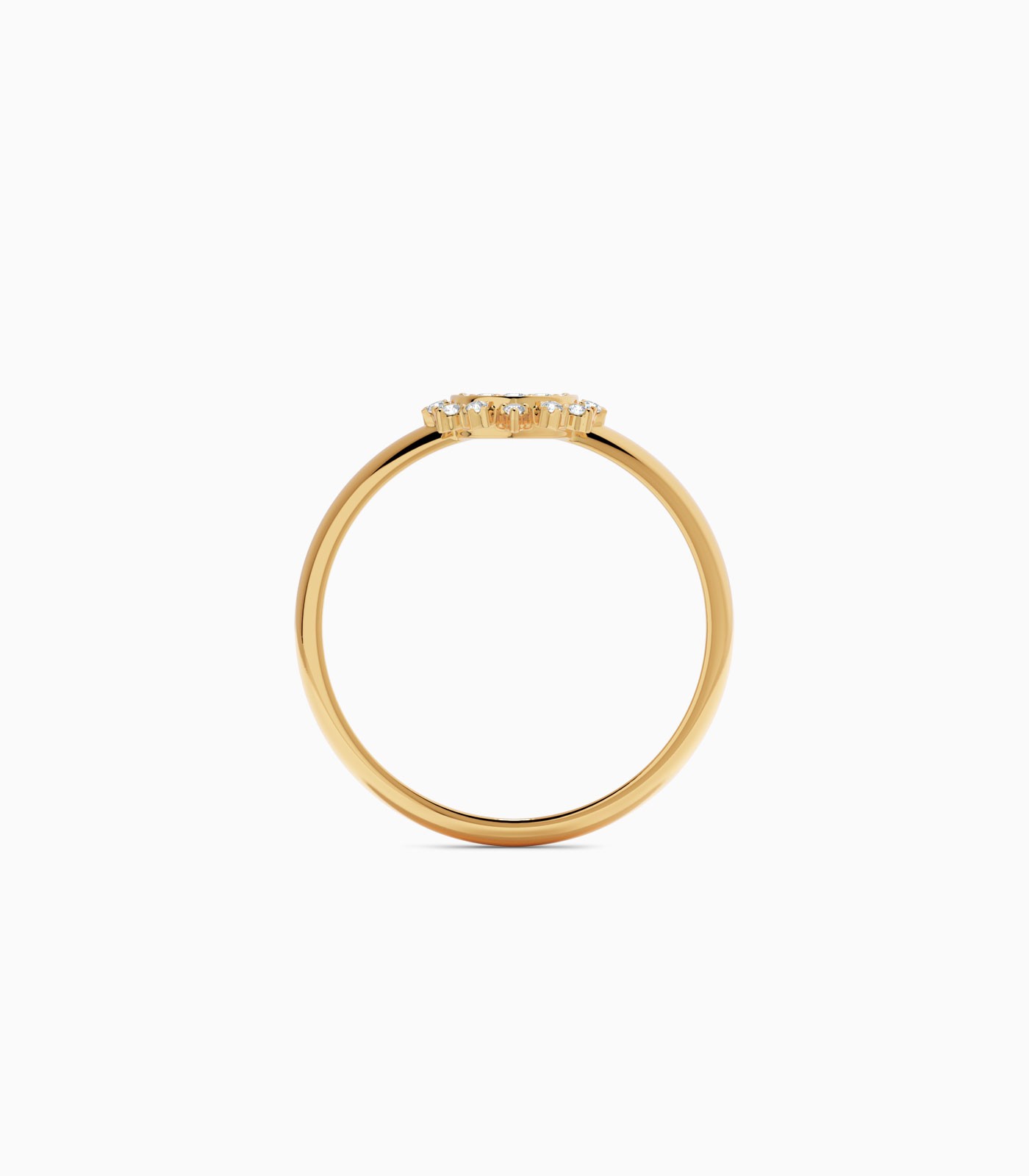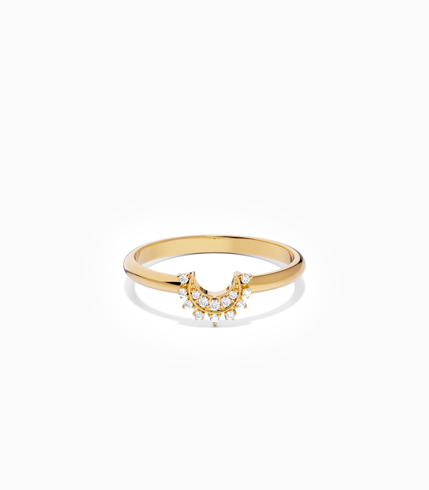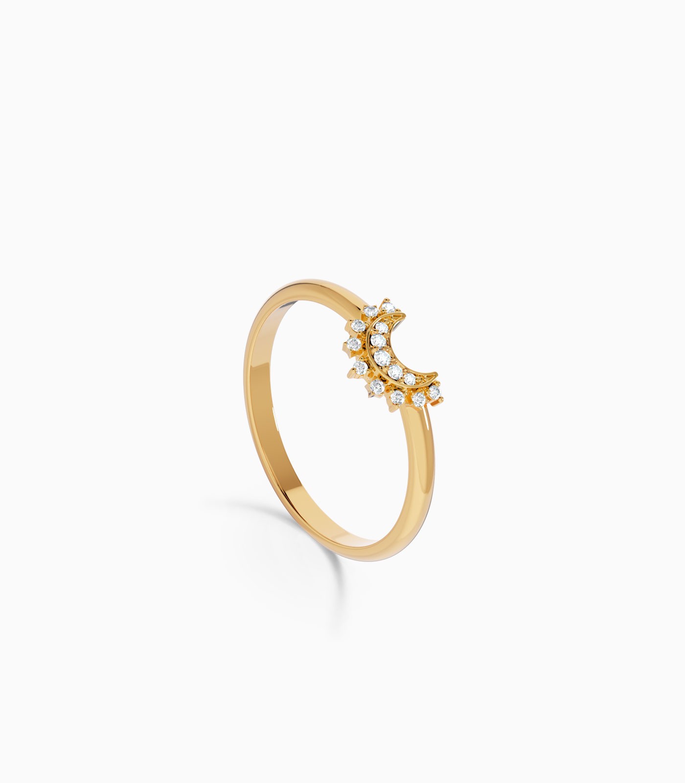 This delicate ring presents a crescent like a crown, outlined in diamonds, offering a unique look. Its minimalist design is perfect for stacking or wearing solo for a touch of elegance. Gift it to your loved ones or let its glory shine on your fingers this festive month.