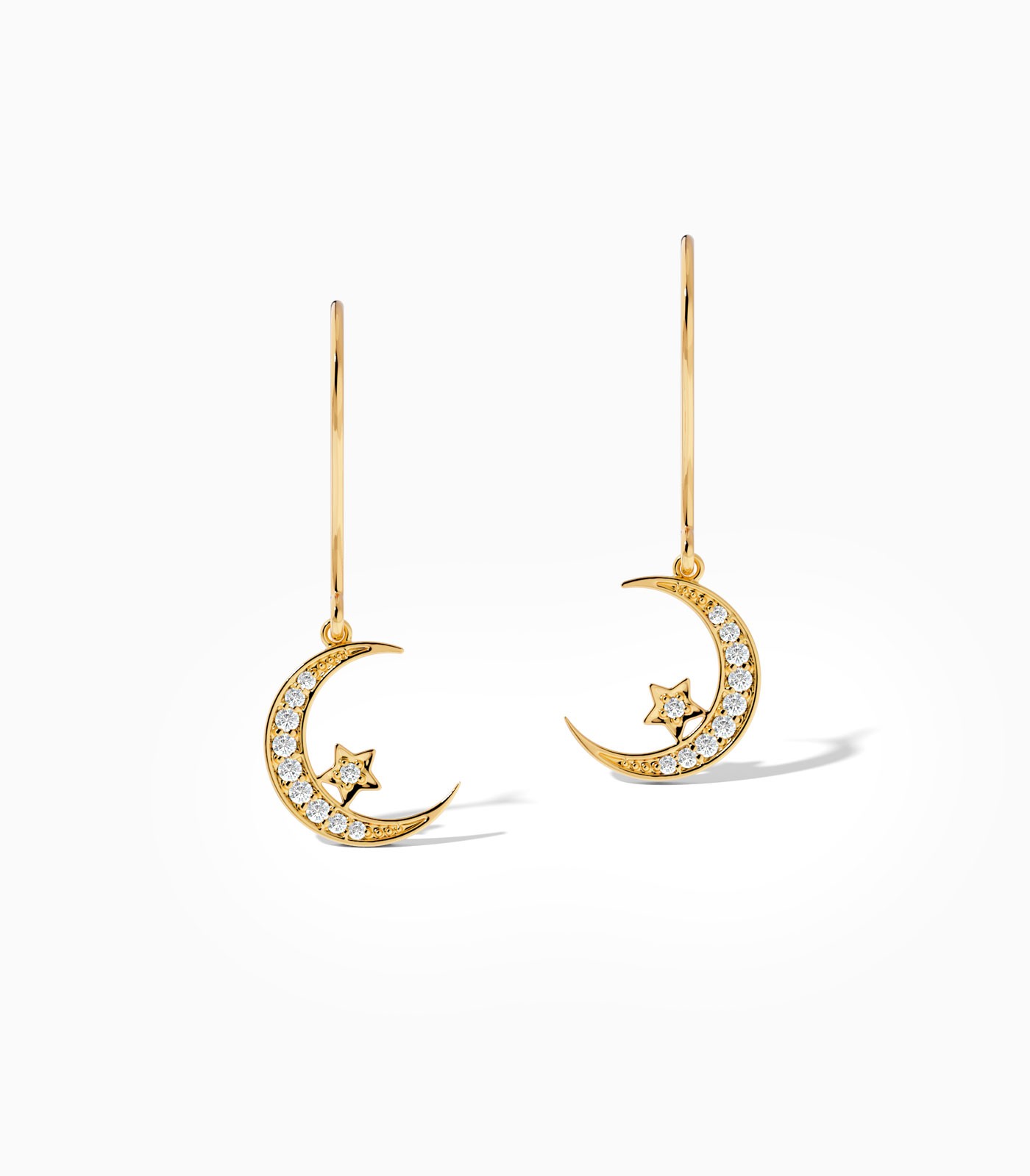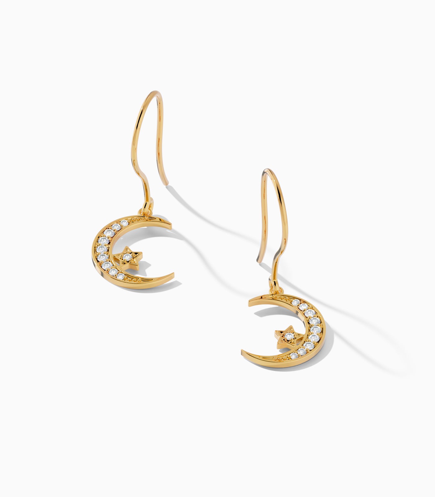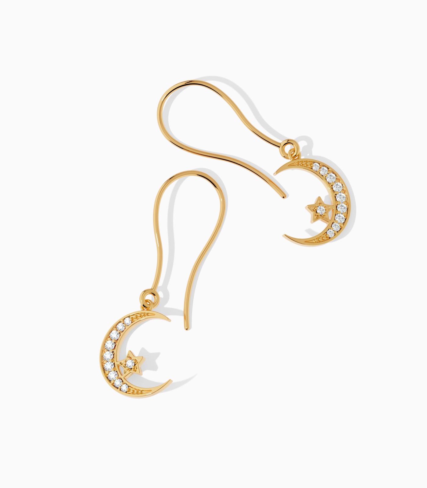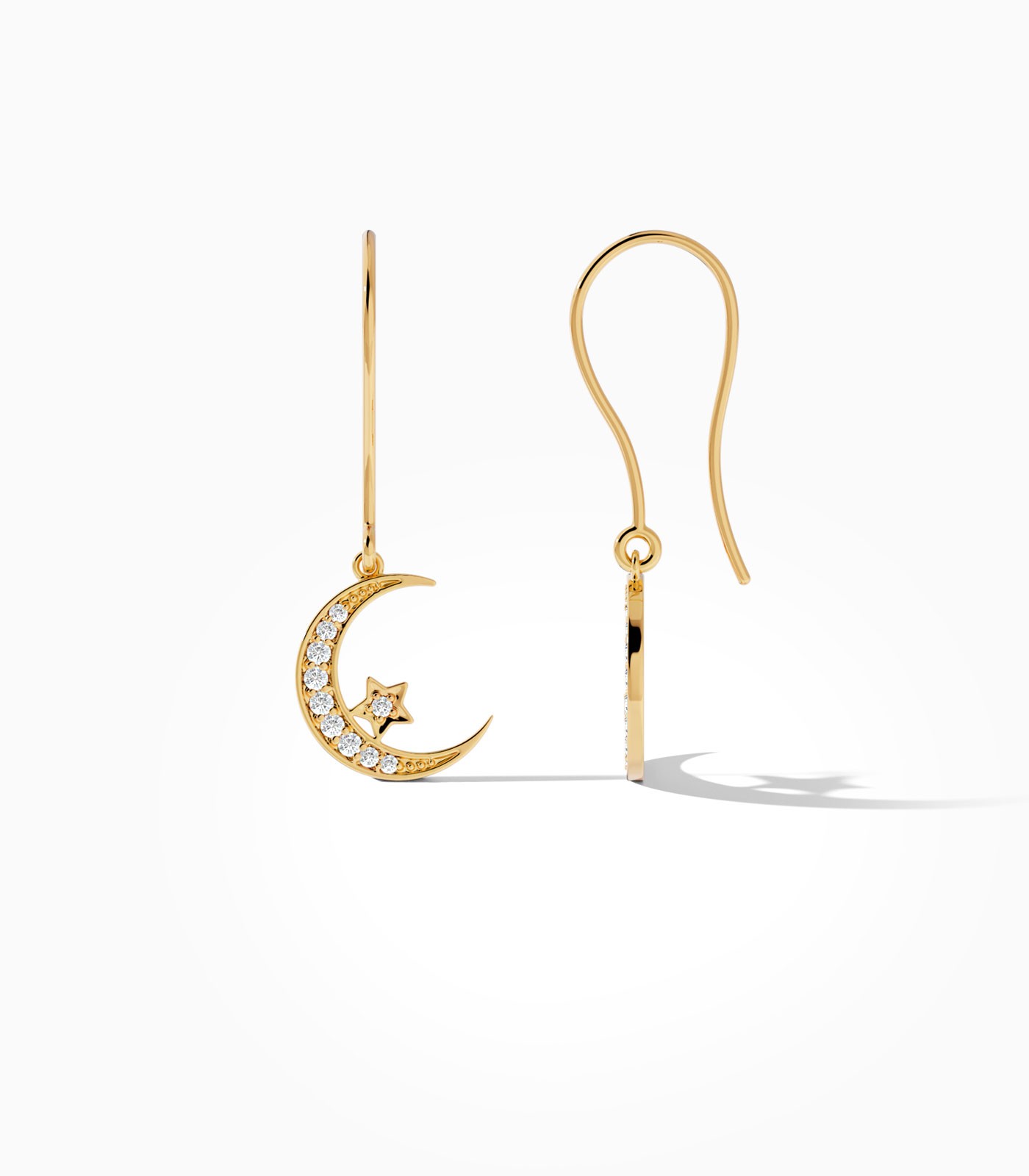 Embrace the spirit of Ramadan with these elegant 18k gold crescent moon earrings, featuring a crescent moon cradling a solitary star, each adorned with sparkling diamonds. Perfect for festive gatherings, they are a beautiful gift or a personal treat to celebrate the holy month.