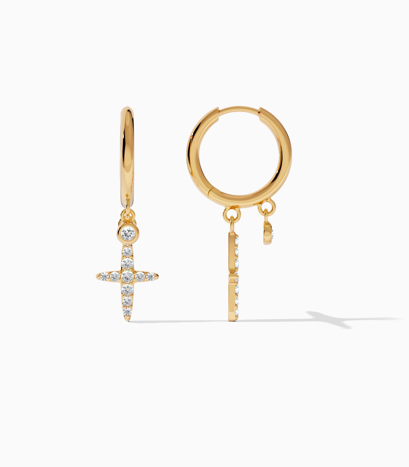 Crafted in pure 18k gold, glistening solid hoops showcase elegant cross-shaped drops which are studded with sparkling diamonds. These earrings combine timeless grace with a touch of spiritual symbolism, ideal for a meaningful gift.