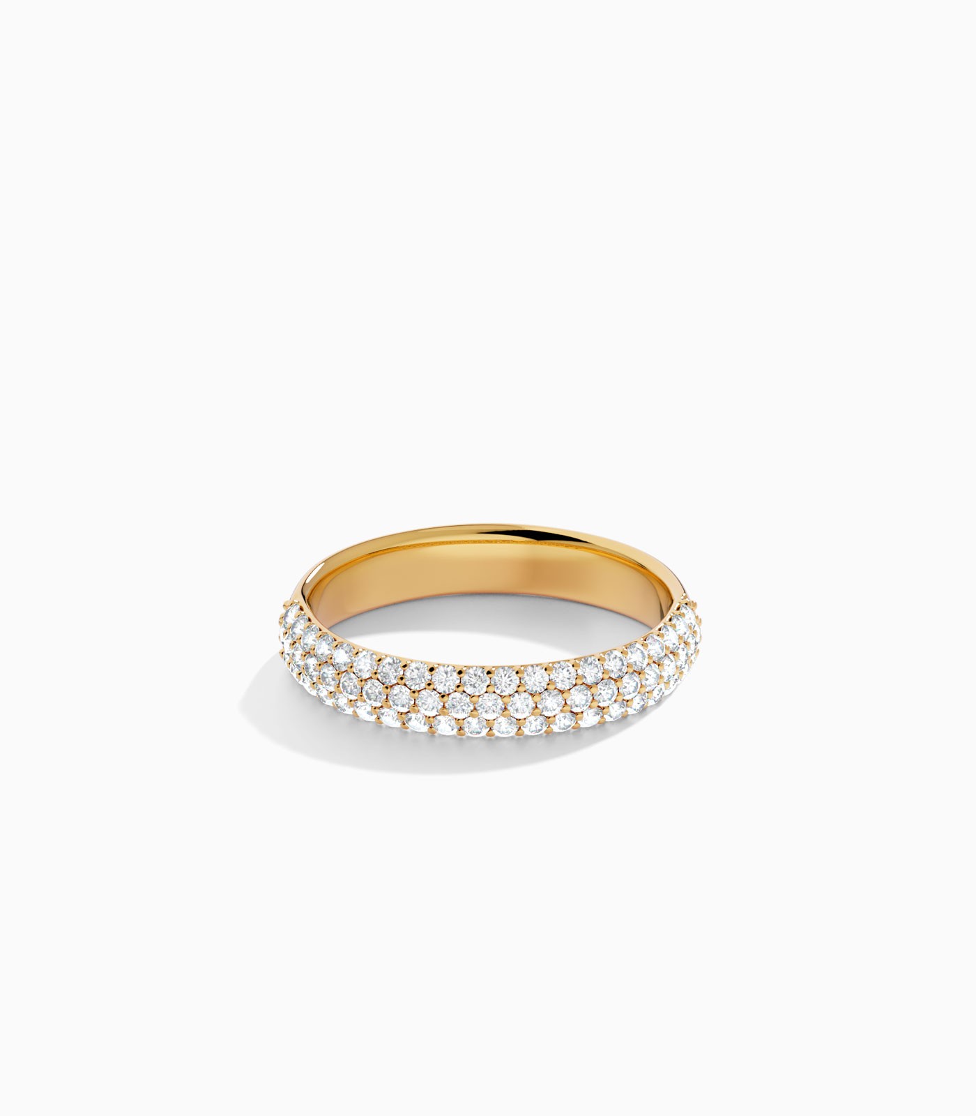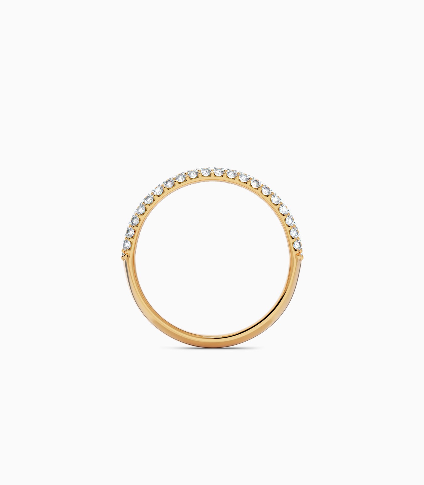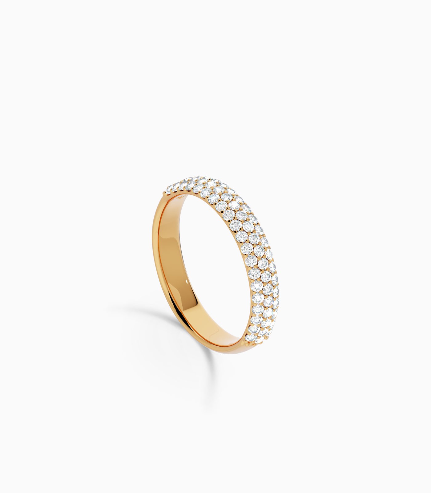 Celebrate love’s eternal glow with this 18k gold wedding band, fully paved with multiple rows of shimmering diamonds, offering unending brilliance with its full eternity design. It’s perfect for both special occasions and adding luxury to everyday wear.