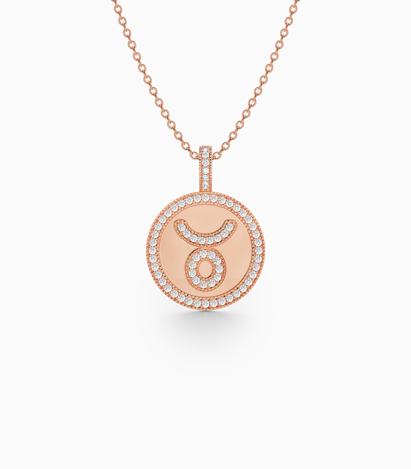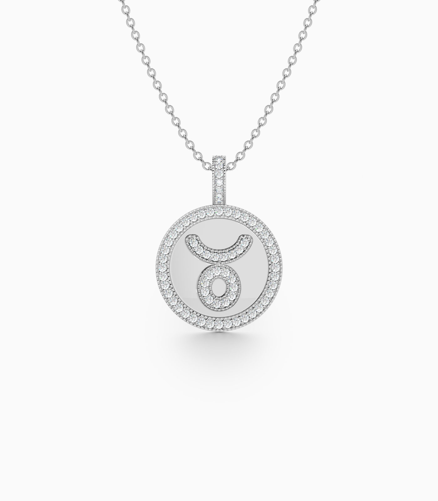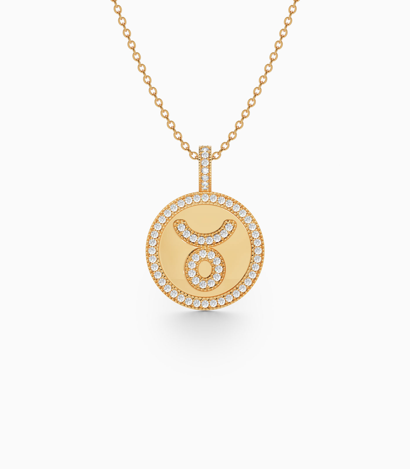 Embody the strength and reliability of Taurus with this exquisite pendant. The Taurus symbol, intricately designed in 18K gold and set with dazzling diamonds, stands out against the glistening disc. Encircled by a shimmering diamond halo, this pendant reflects the loyalty of those born under this earth sign.