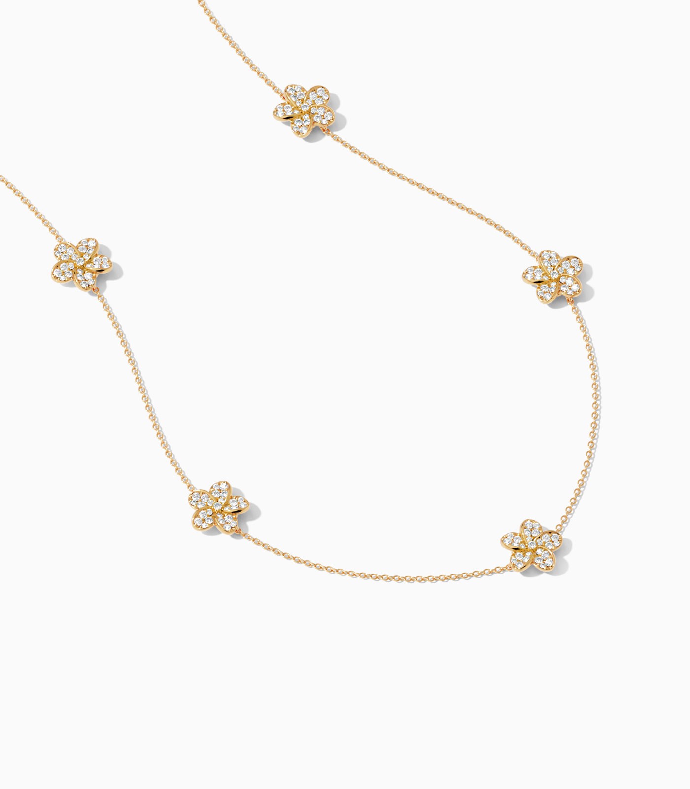 Grace your neckline with this solid 18k gold necklace, a vision of floral finesse. Beautiful diamond-studded flowers are evenly spaced along a fine gold chain, offering a sparkling look of elegance for both casual and formal attire.
