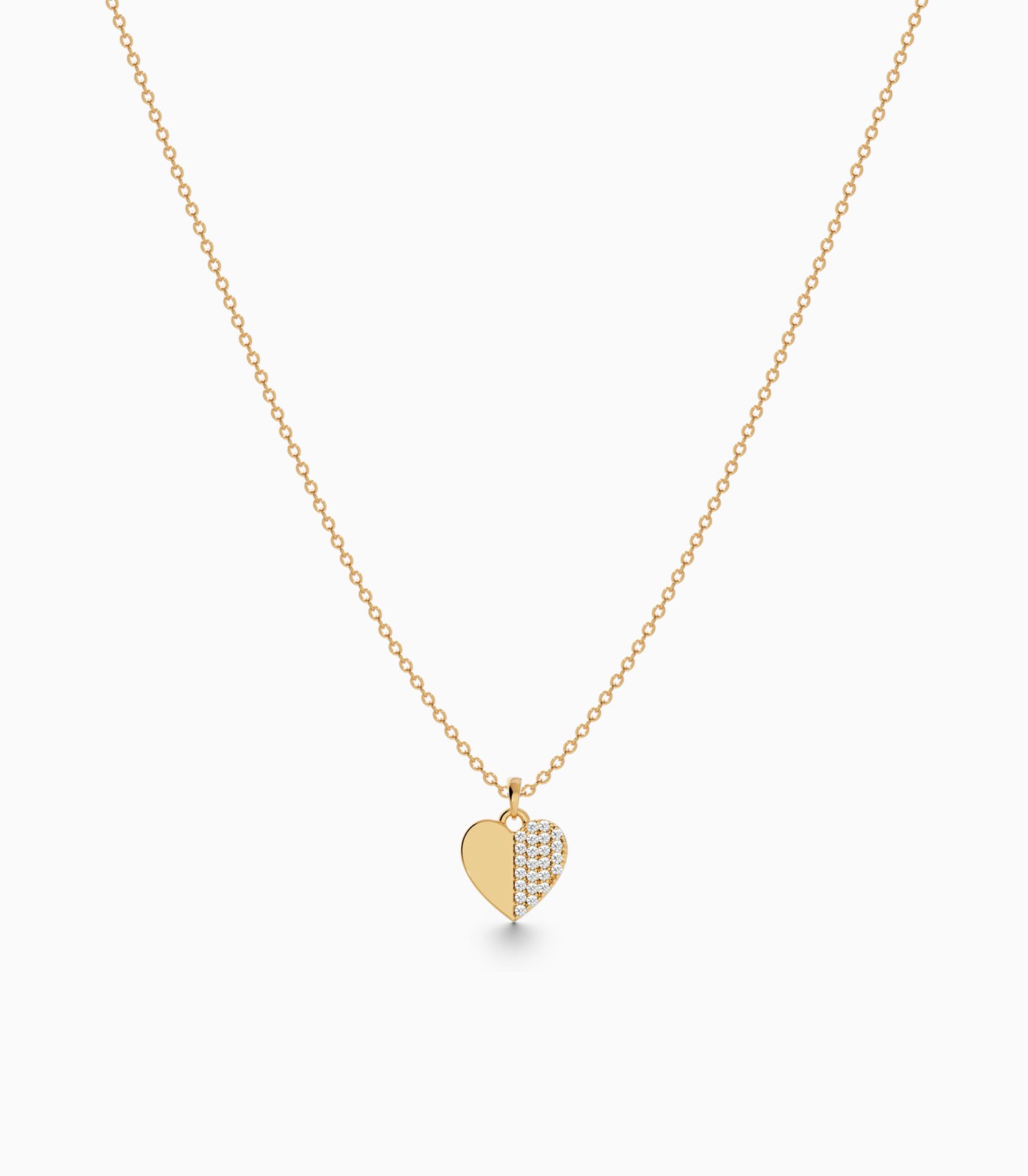 This pendant is the perfect harmony of minimalism and sparkle. Crafted from solid 18k gold, one half gleams with brilliant diamonds in a plate prong setting. A chic piece made for those who want to add a little bling to their style.