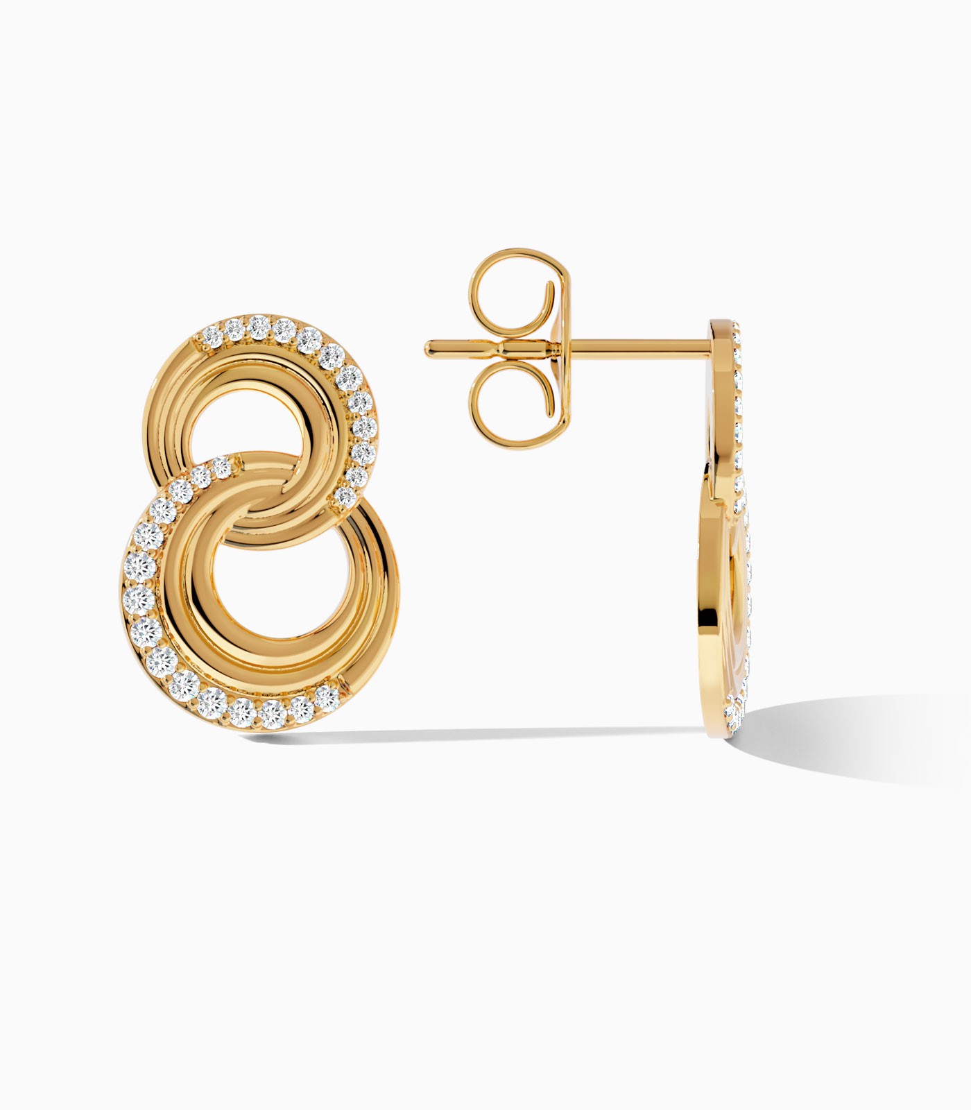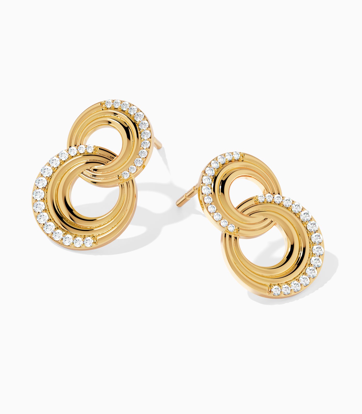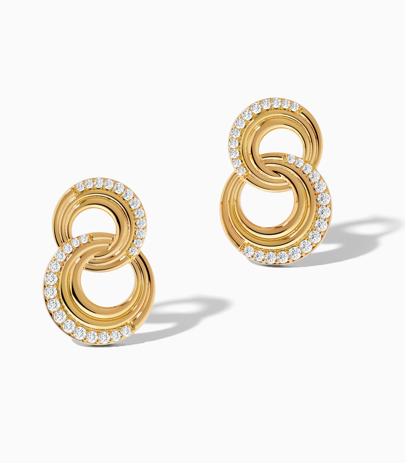 These 18k gold interlocking loop earrings present a unique, fascinating design of two circles intertwined, their edges embellished with precision-set diamonds. The dual-loop form plays with light and space, creating a mesmerizing effect.