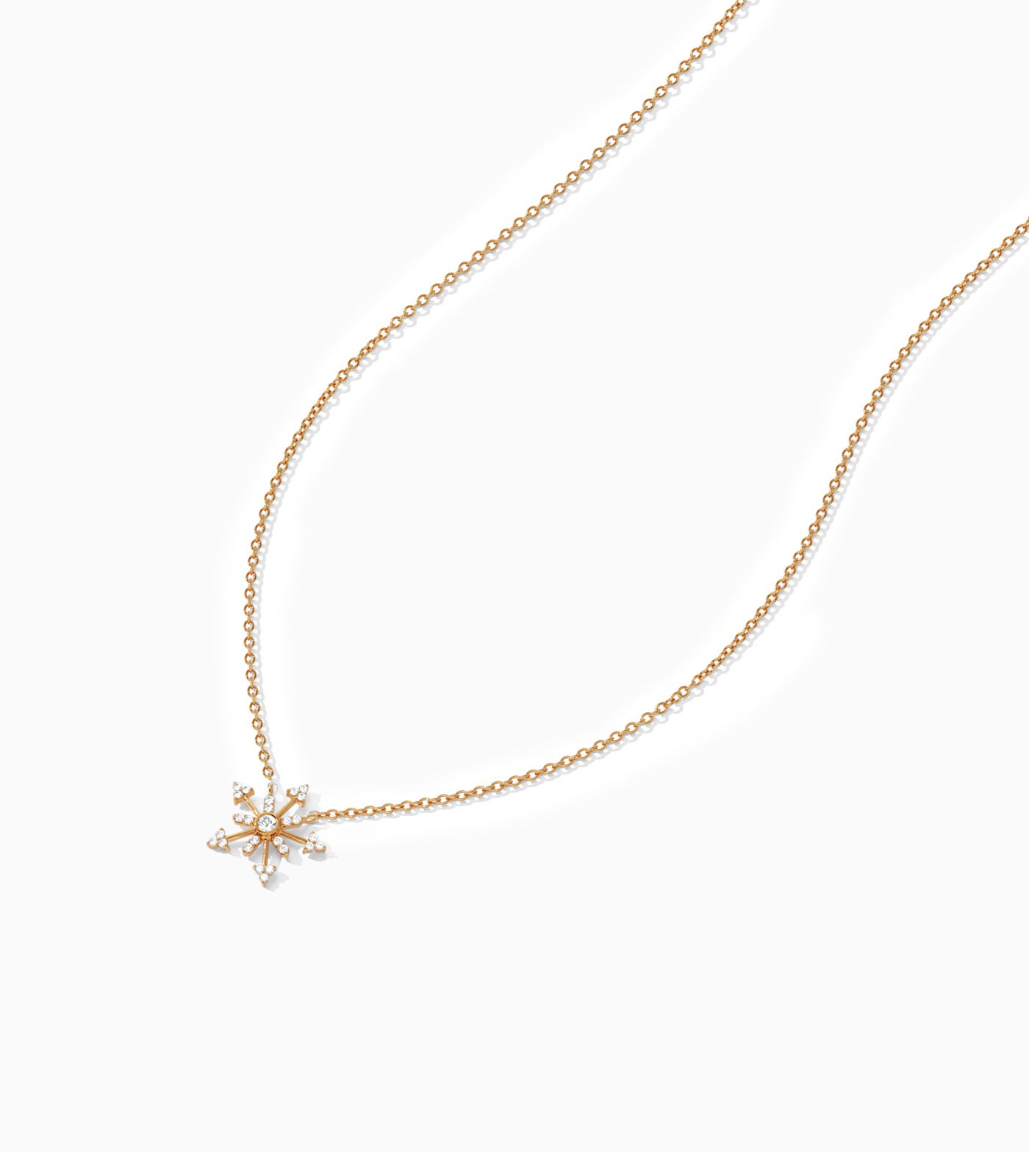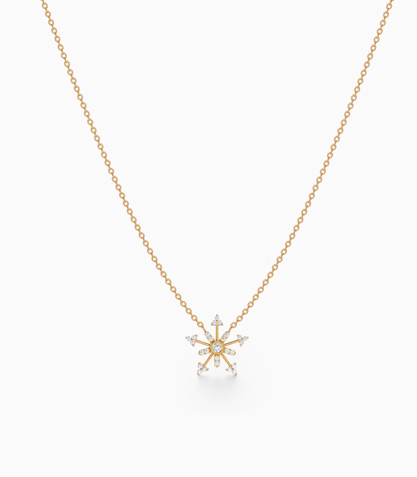 Illuminate your neckline with this sunburst pendant, elegantly crafted in 18k gold. Central to the design is a lustrous diamond, encircled by dazzling rays again studded with tiny round diamonds. With a unique touch of arrow ends, this versatile addition is perfect for adding a touch of sunshine to any look.