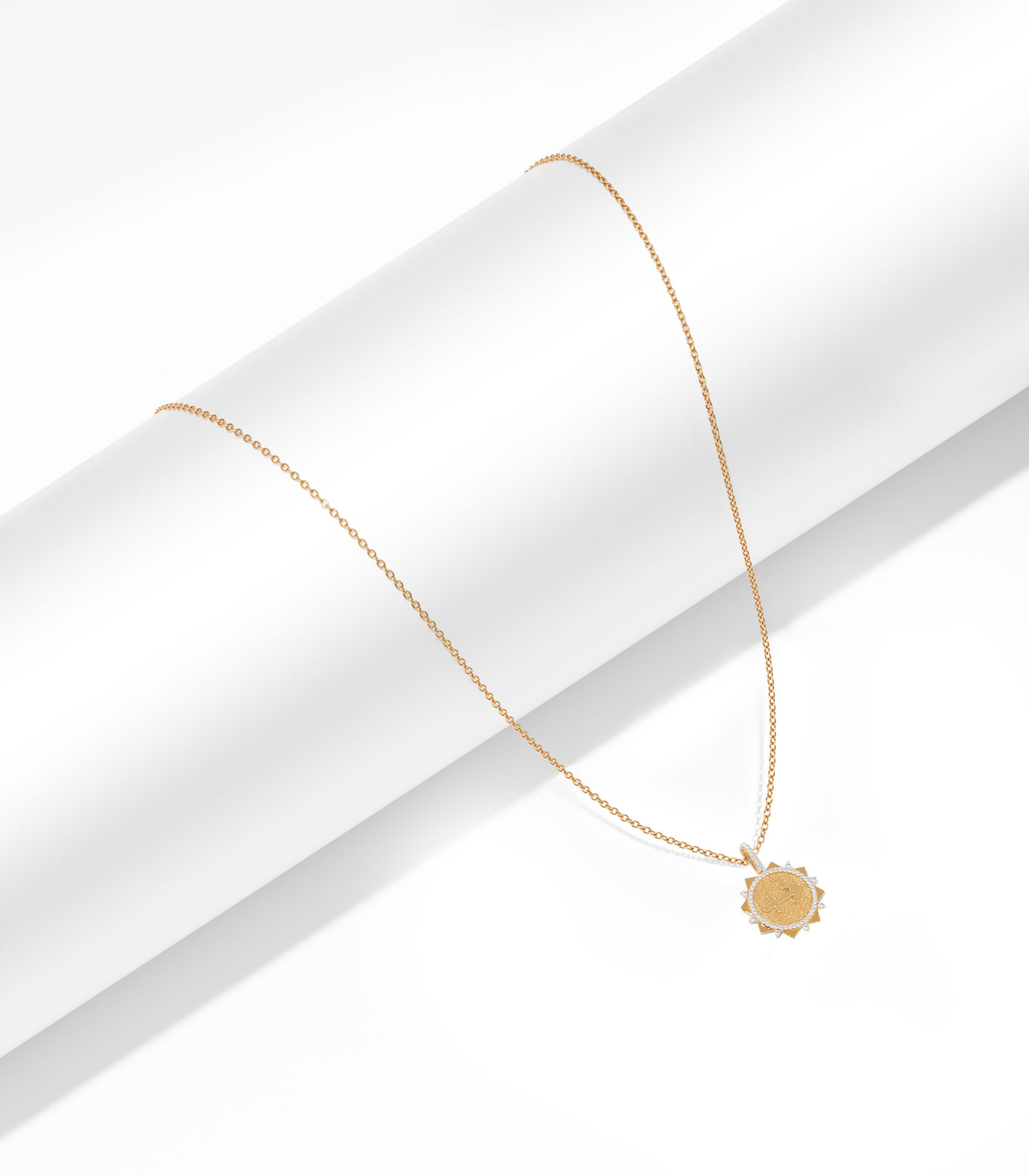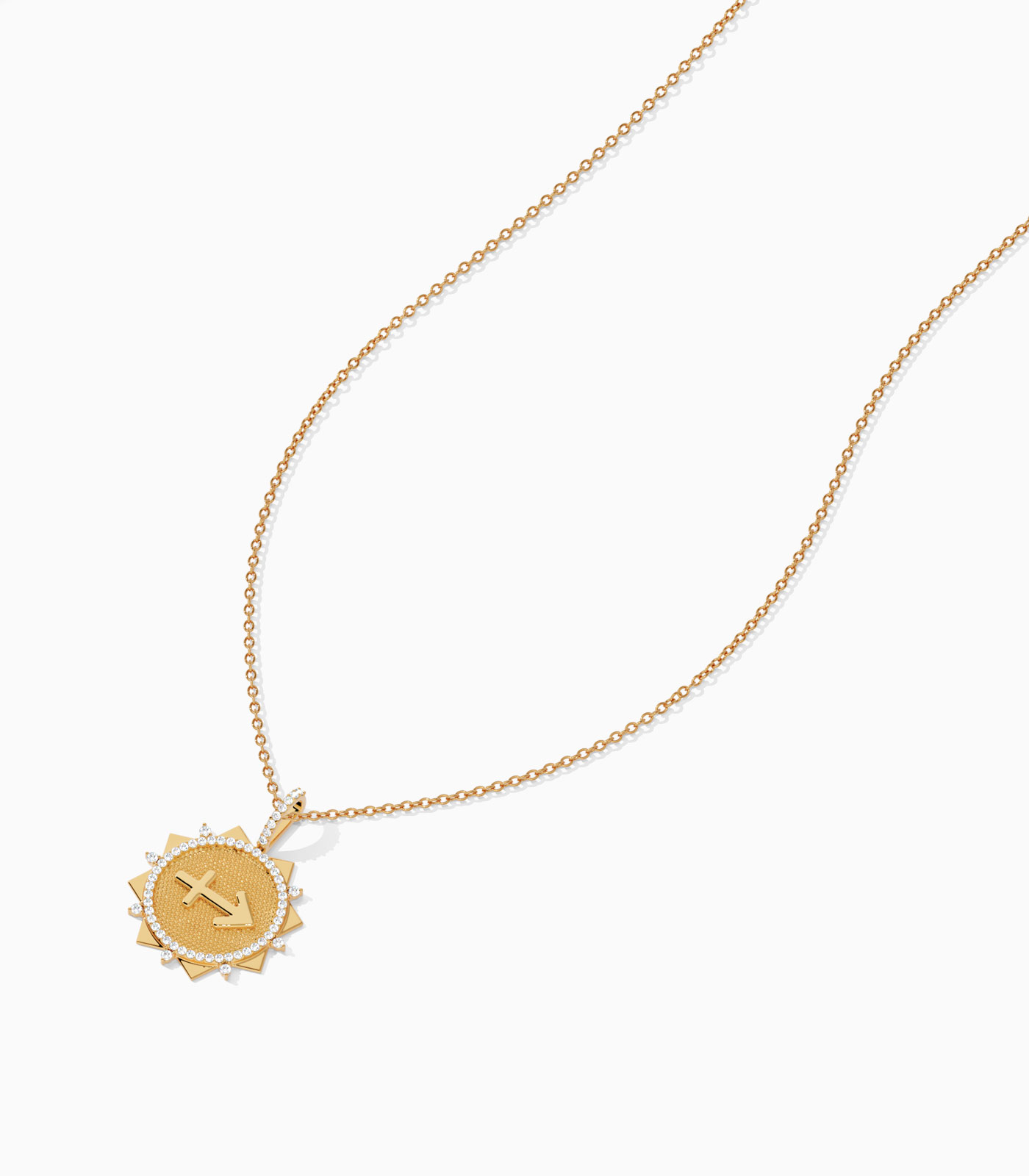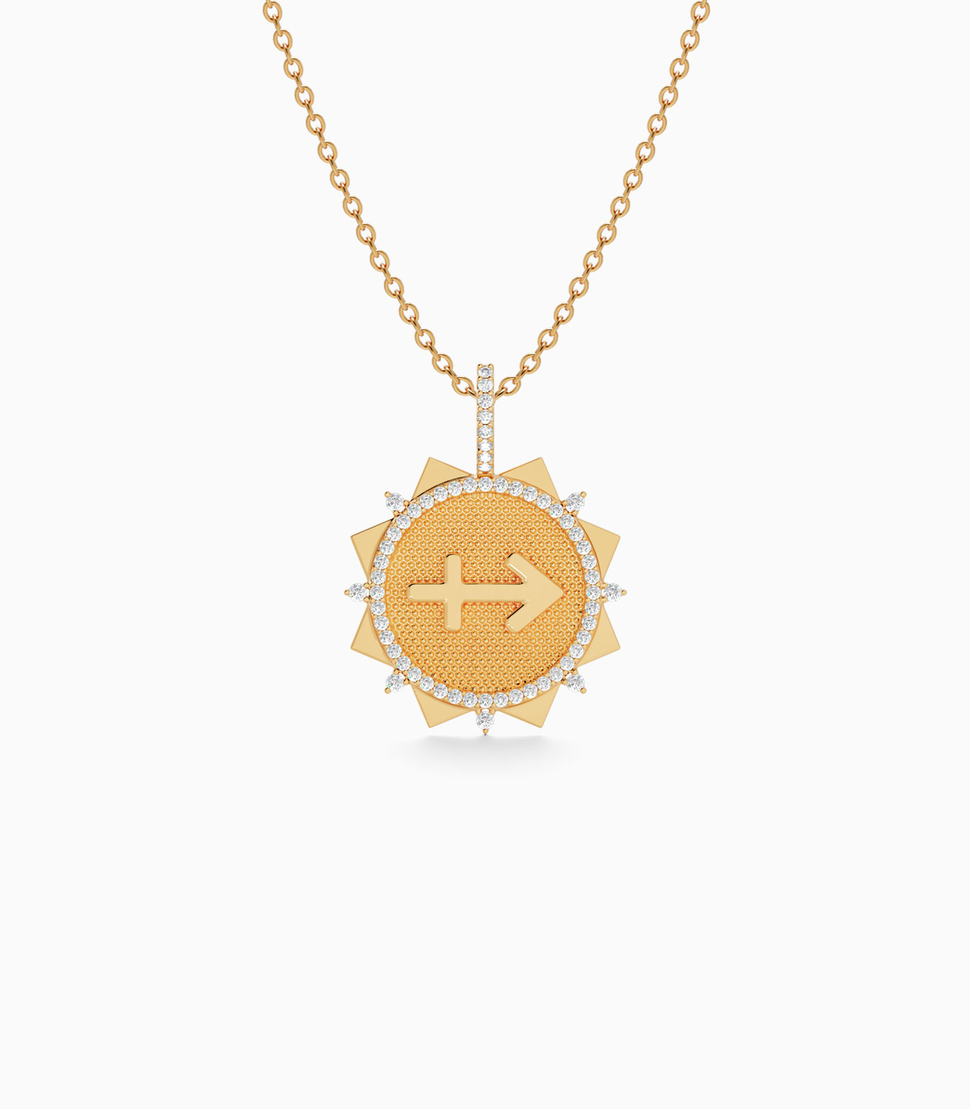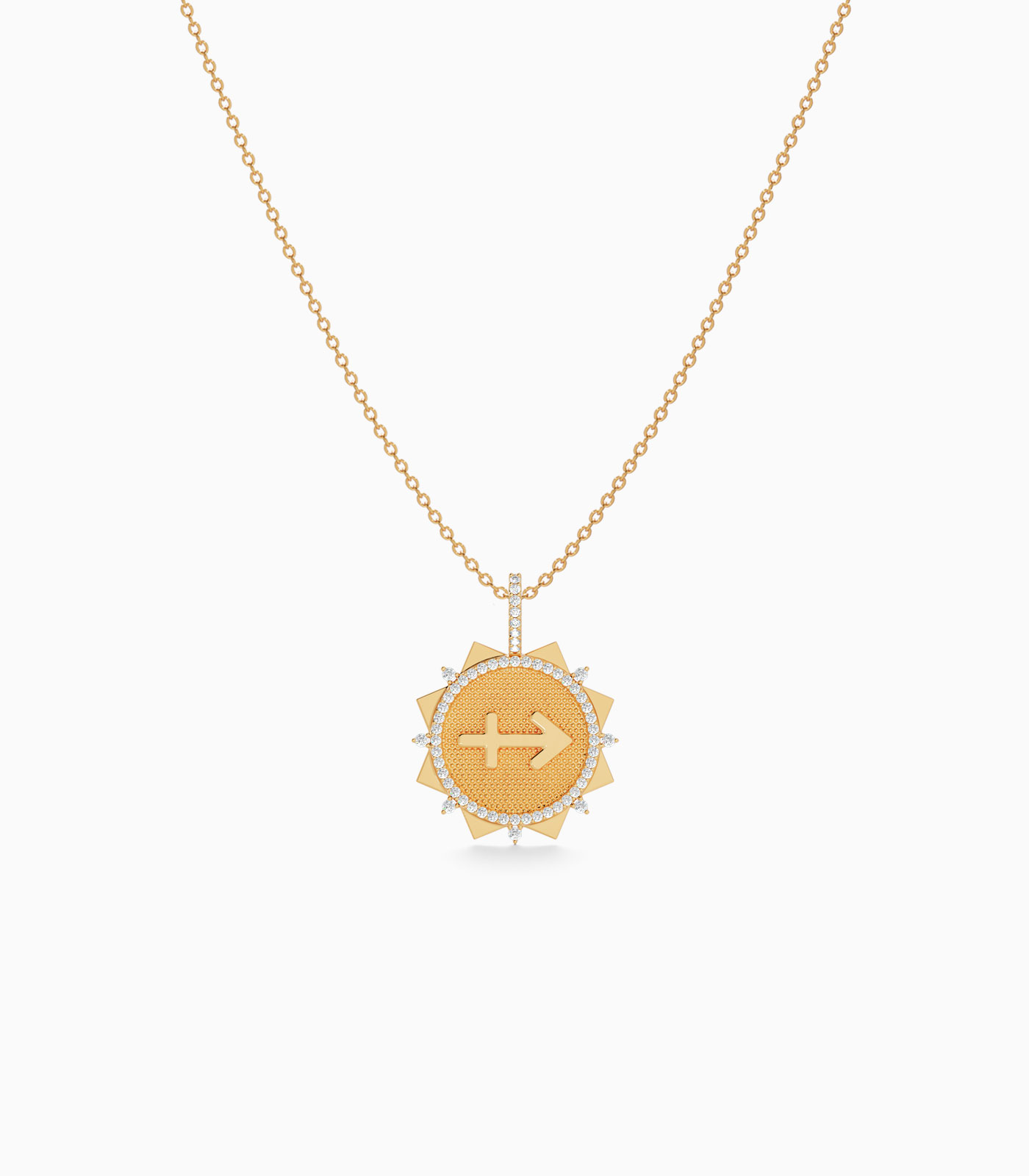 Break free your adventurous spirit with our bold Sagittarius pendant, made with love in 18K gold. The dynamic sunburst design with a textured central disc and diamond accents captures your love for optimism. Perfect for the Sagittarius who embodies wanderlust and wisdom.
