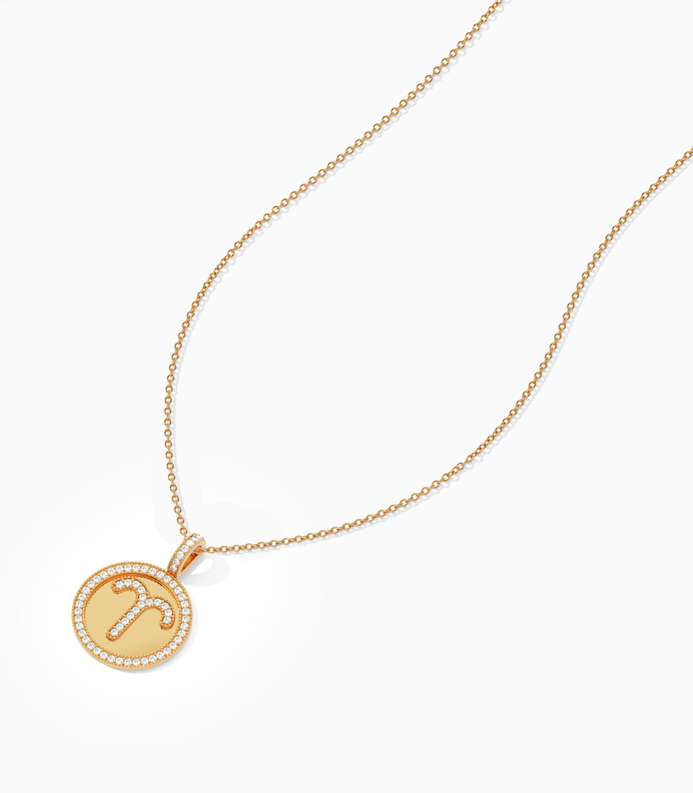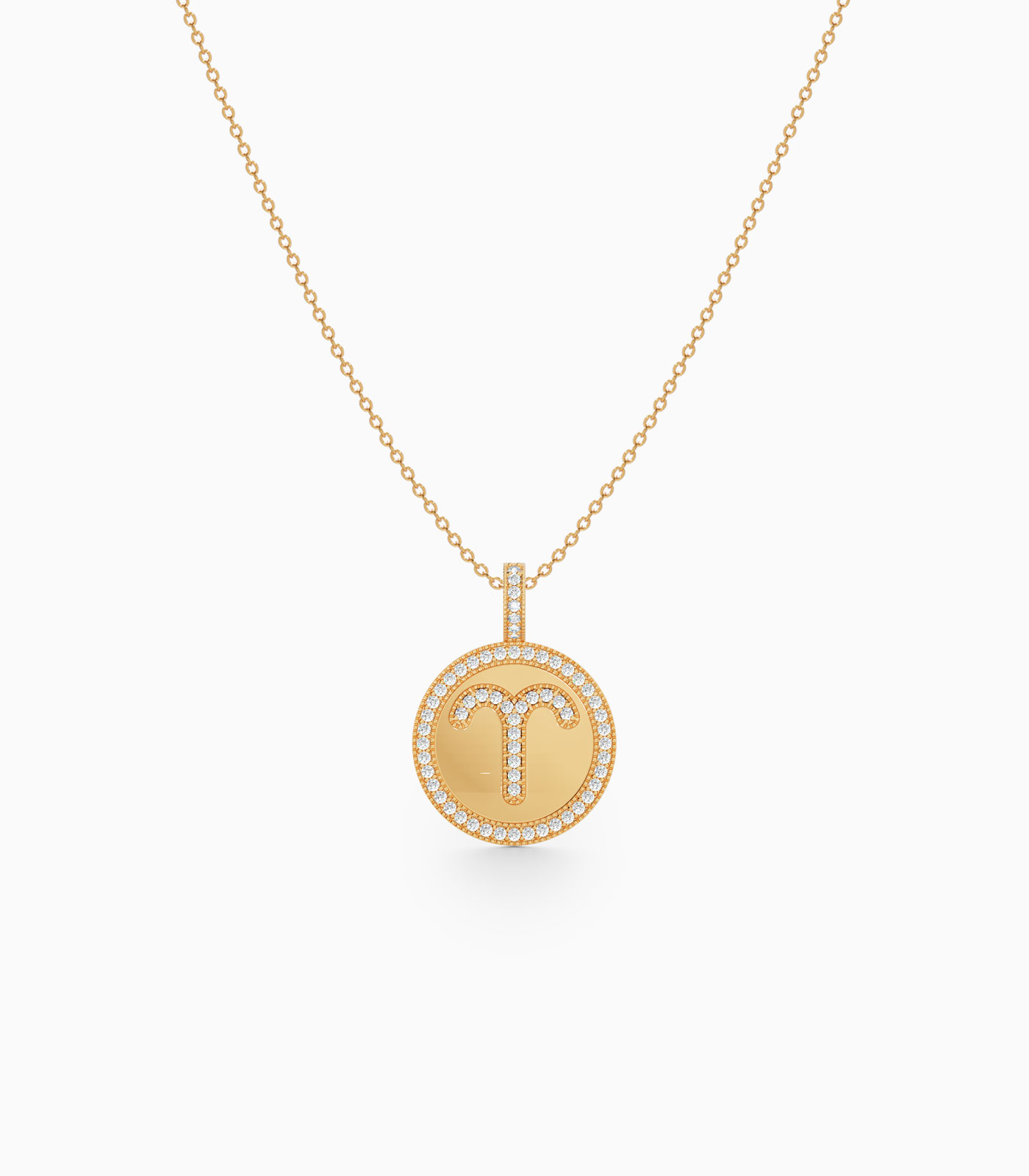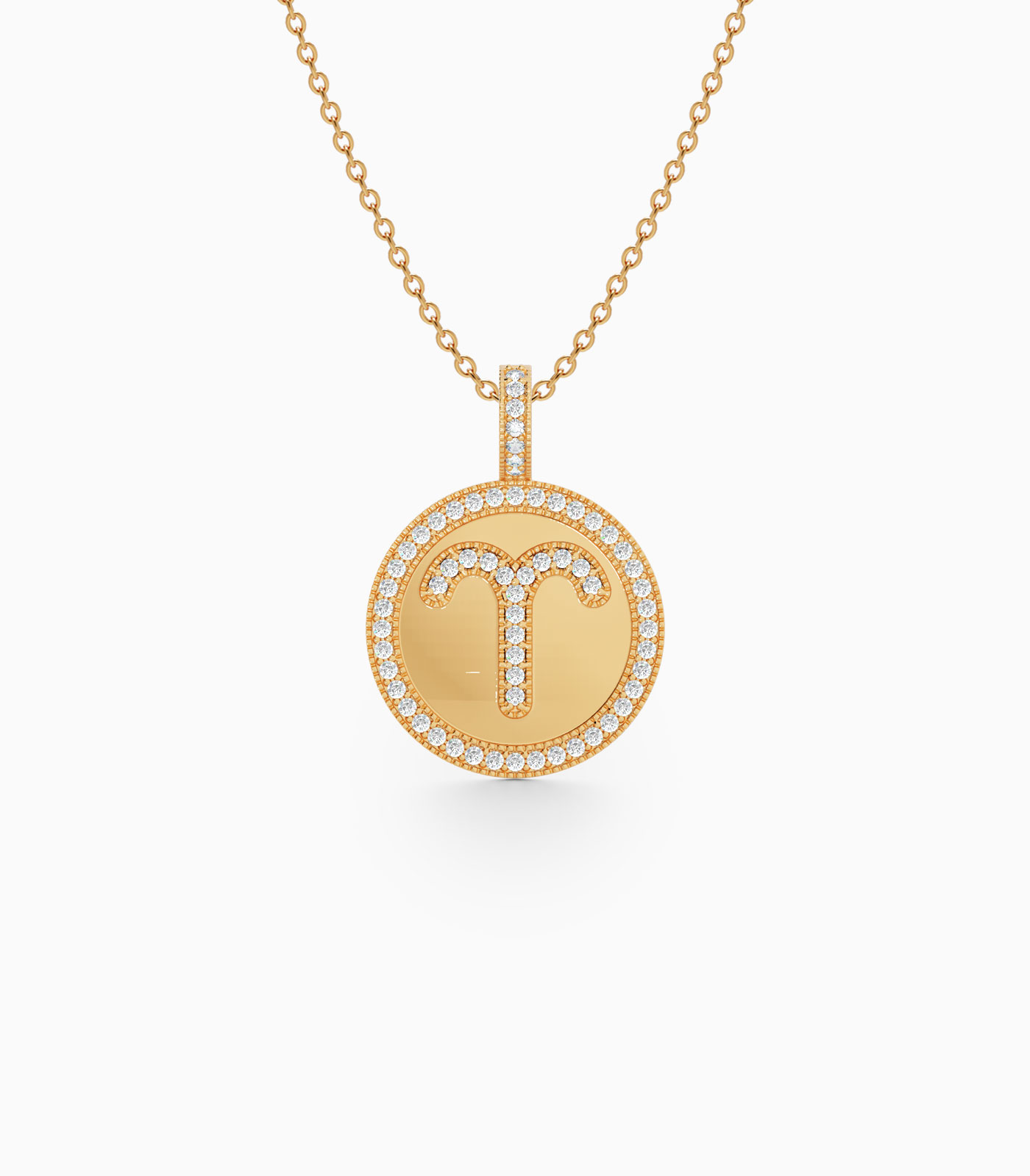 Channel the fierce energy of Aries with this stunning pendant. The Aries symbol is beautifully crafted in 18K gold and adorned with sparkling diamonds. The pendant’s smooth, polished disc is framed by a glittering halo of diamonds, adding a touch of elegance to its bold design.