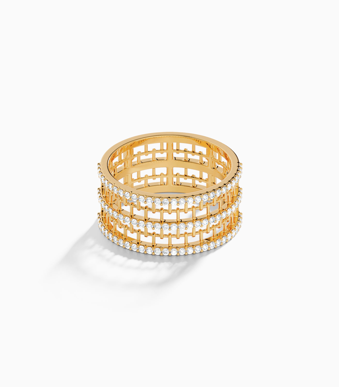 This stunning ring crafted from 18k gold, features three rows of dazzling diamonds set in an intricate, openwork mesh band design. The combination of luxurious gold and brilliant diamonds creates a bold yet elegant statement piece, perfect for any occasion.