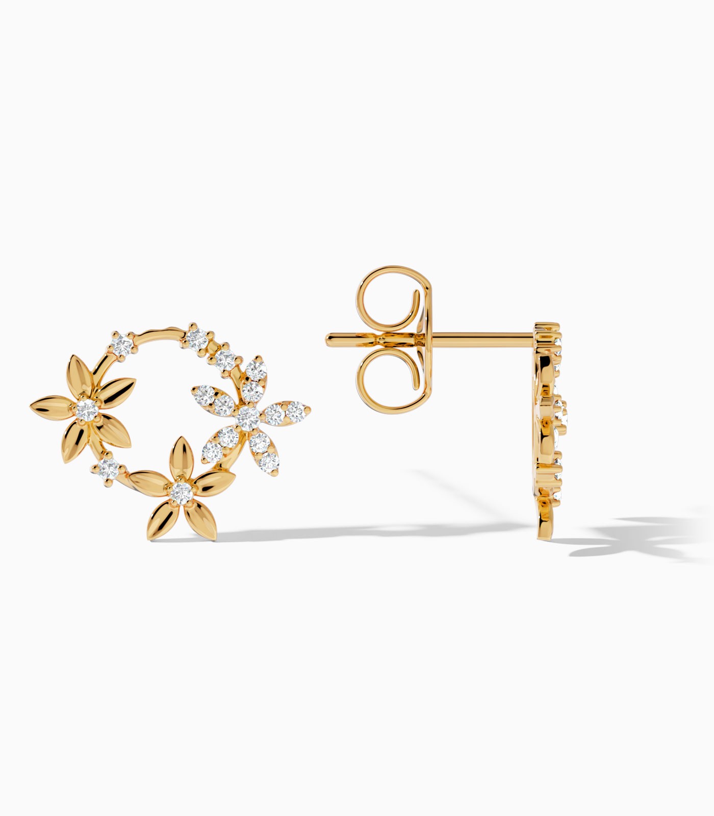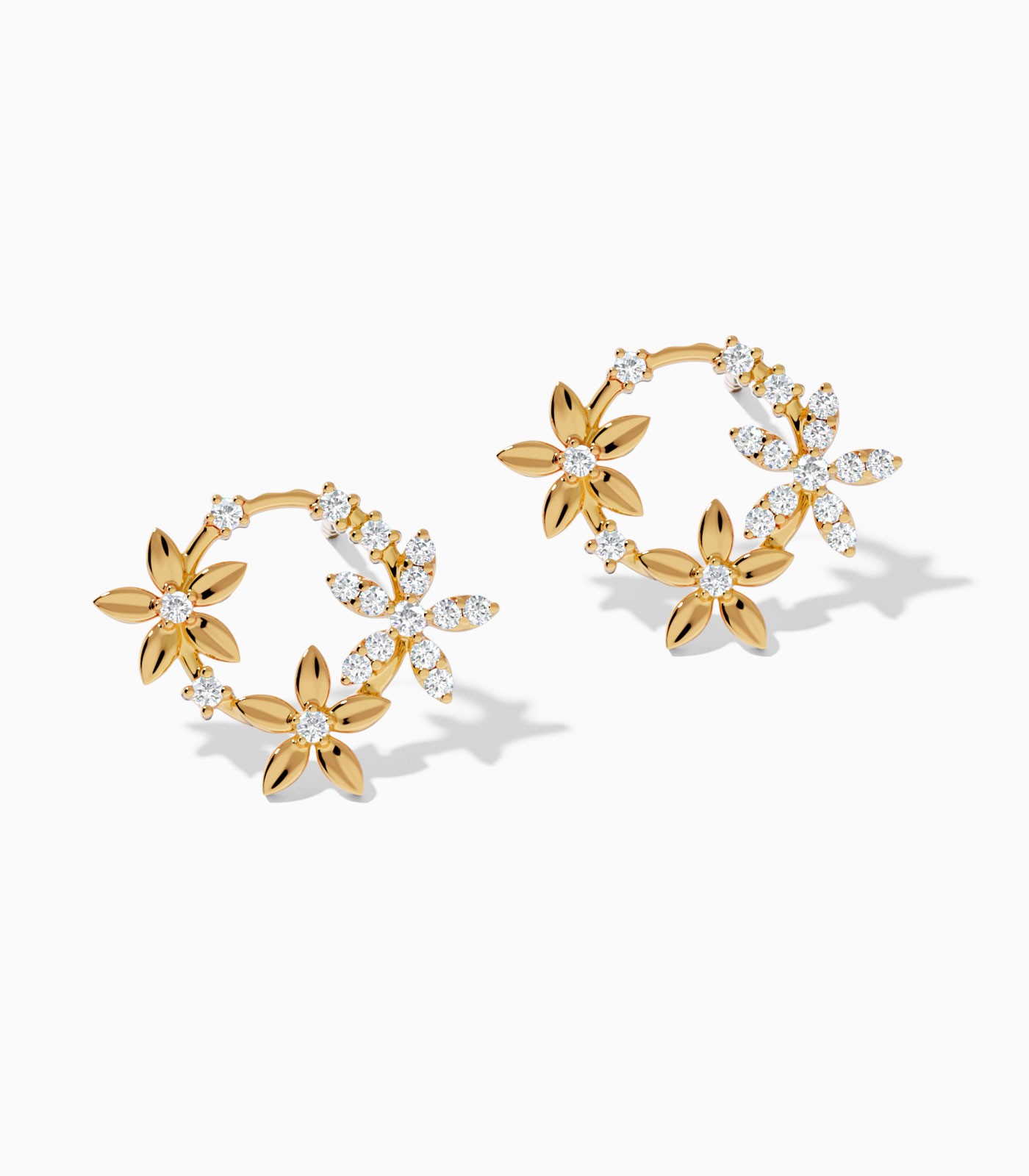 Three 18k gold flowers, one diamond-studded and two graced with central diamonds, unite to form these floral stud earrings. They bloom together creating a delicate bouquet that adorns the ear, making them an exquisite selection gift.